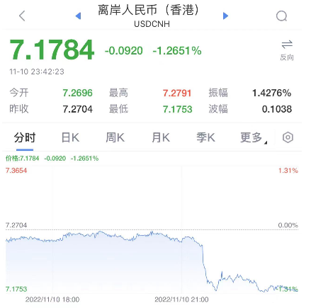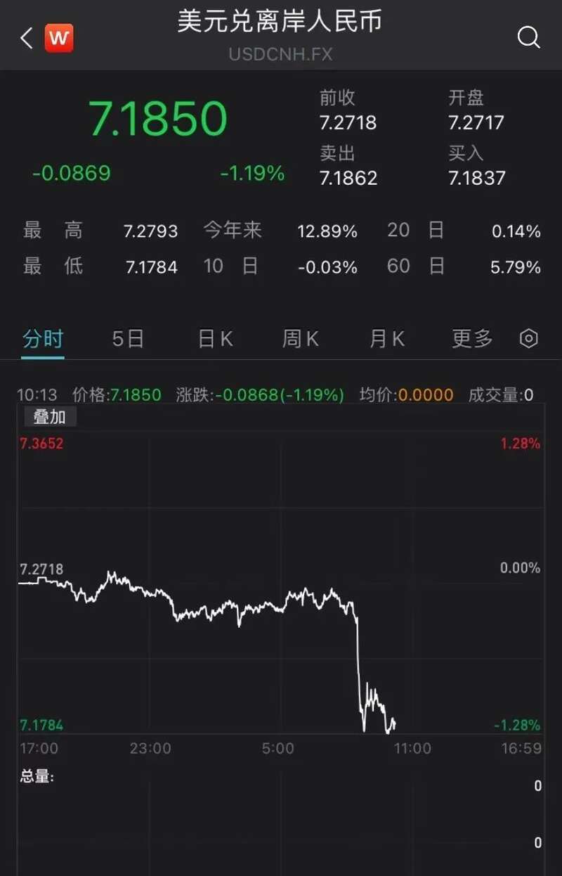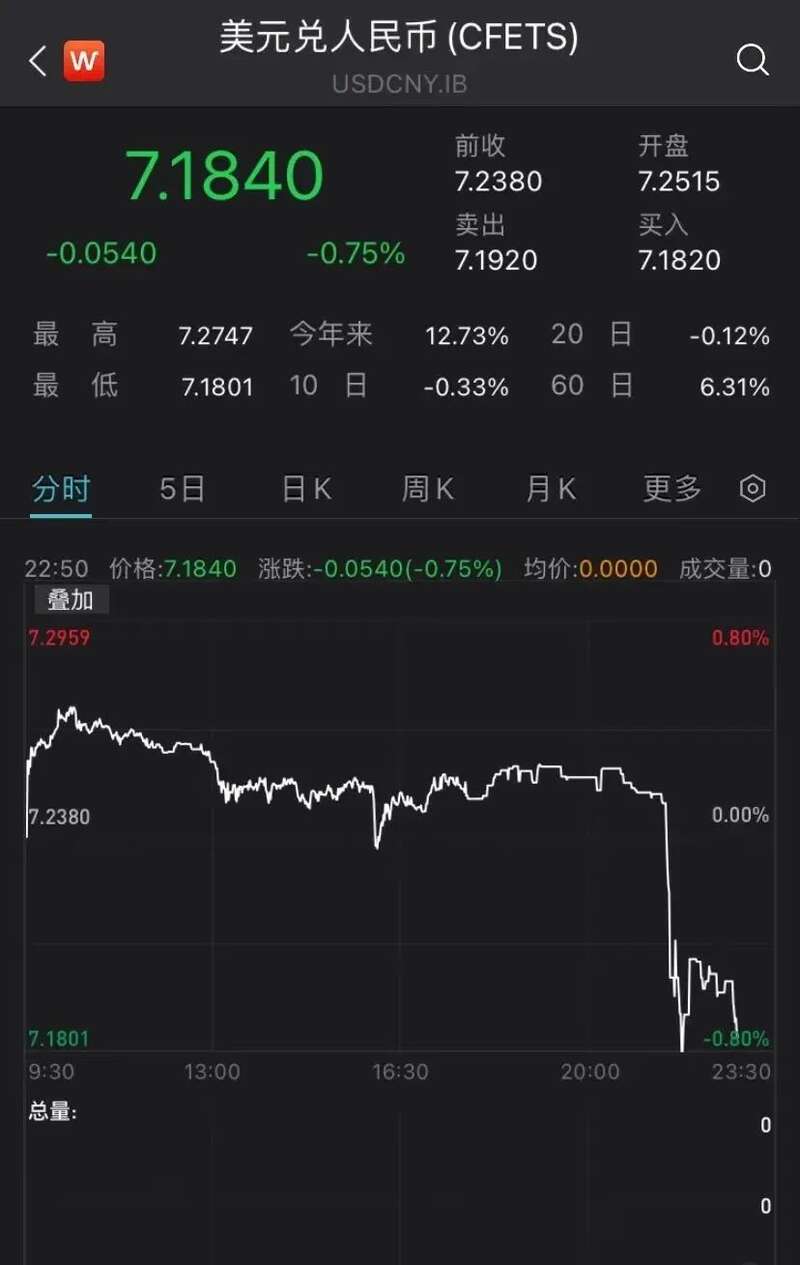 人民币兑美元短线拉升,离岸人民币兑美元直线拉升,日内涨近900点,现报7.1850;在岸人民币兑美元日内涨超500点,现报7.1840。