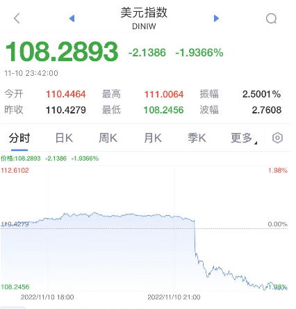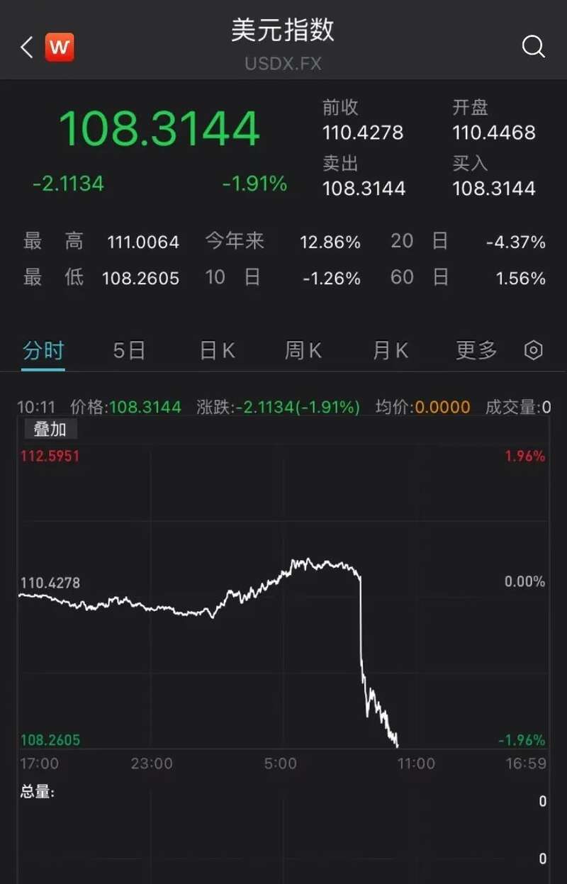 美国通胀数据公布后,美元指数下挫近2%,现报108.3144。