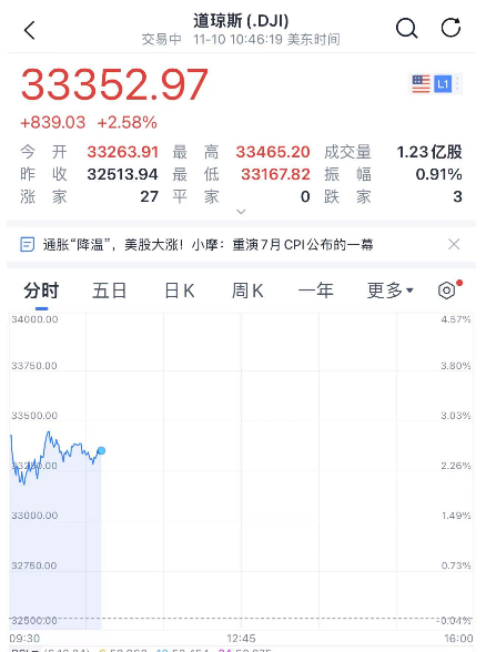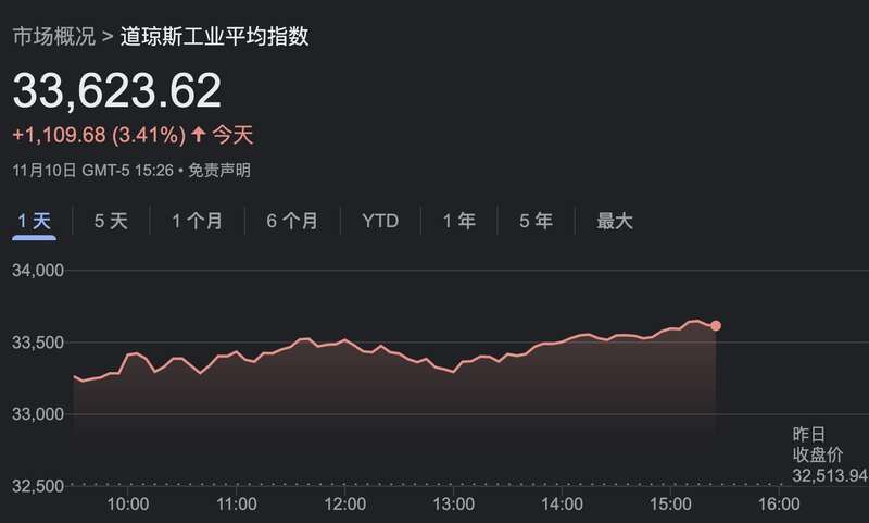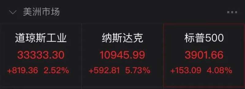 10月通胀数据公布后,三大股指暴力拉升,截至发稿,标普500指数涨4.08%;道指涨2.52%;纳斯达克指数涨5.73%。
