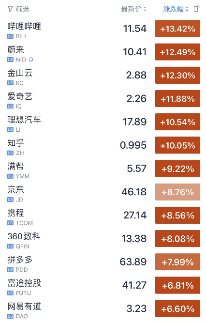大型科技股集体大涨,亚马逊涨超9%,谷歌涨超6%。纳斯达克中国金龙指数涨超7%,小鹏汽车涨超5%,蔚来汽车、理想汽车涨10%,哔哩哔哩涨超12%。