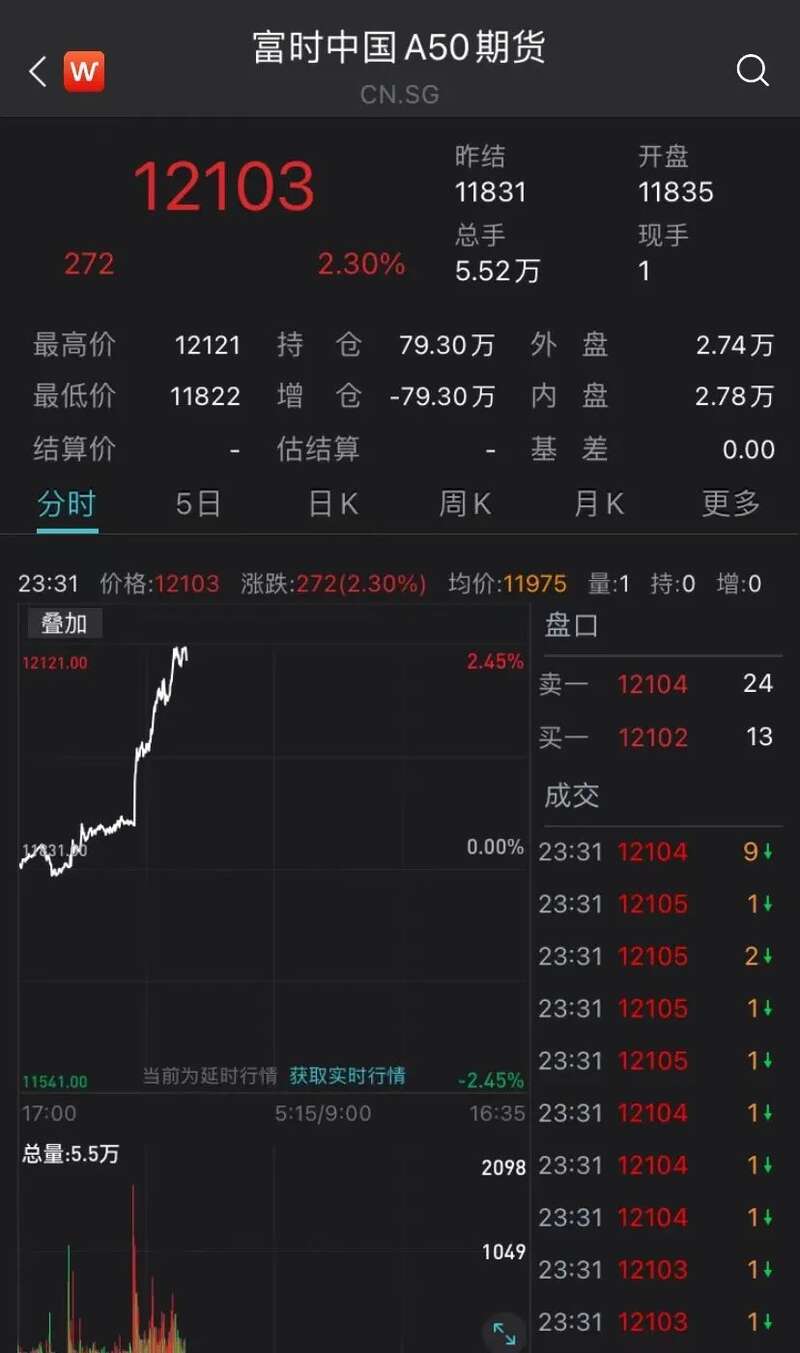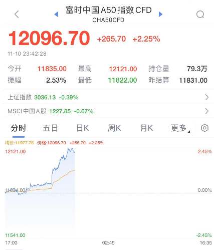 截至发稿,富时中国A50指数期货涨2.3%。