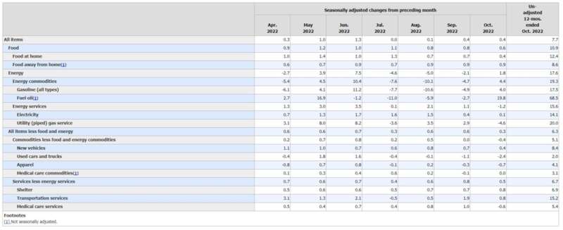 消费者价格指数是衡量商品和服务成本的广泛指标。数据显示,美国10月消费者价格指数环比仅上涨0.4%,同比上涨7.7%。这是自1月份以来的最低年度增幅。