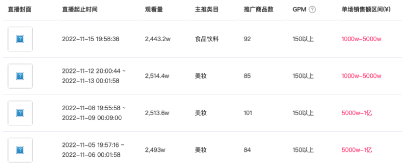 根据星图后台的数据,疯狂小杨哥近几次带货每次观看量都达到了两千多万,单场销售额区间均在 1000 万 – 1 亿之间,当之无愧的 Top 级别。
