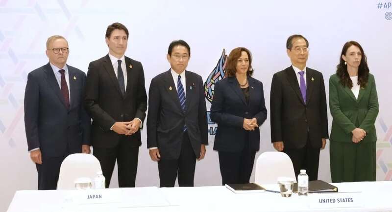 ▎当地时间2022年11月18日,泰国曼谷,(从左至右)澳大利亚总理安东尼·阿尔巴尼斯、加拿大总理贾斯廷·特鲁多、日本首相岸田文雄、美国副总统卡玛拉·哈里斯、韩国总理韩德洙和新西兰总理杰辛达·阿德恩出席APEC会议。