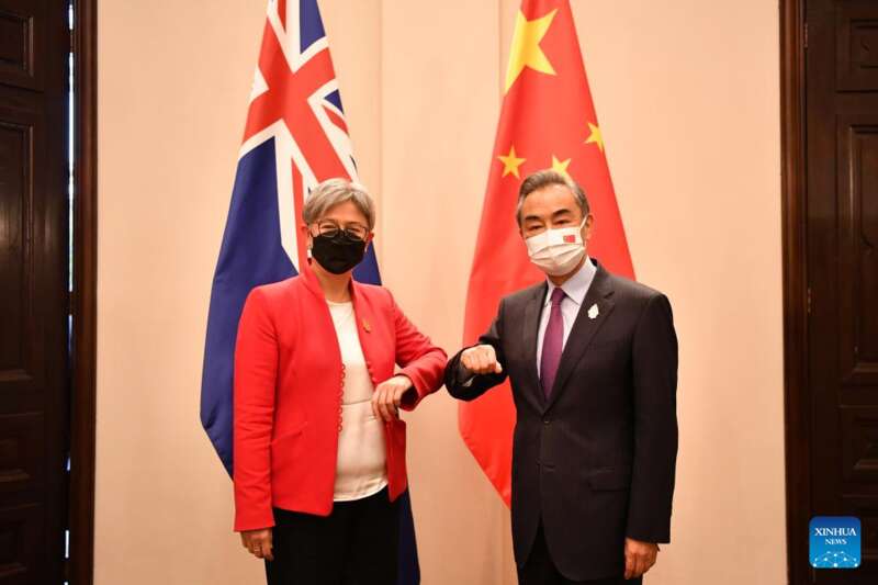 ▎当地时间2022年7月8日,印尼巴厘岛,G20外长峰会上中澳两国外长时隔三年来的首次线下会晤。图源:新华社