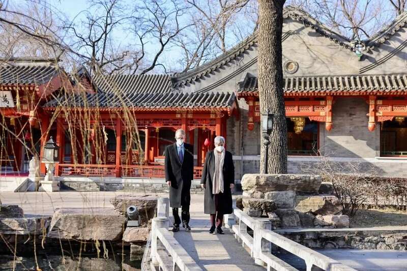 ▎2022年12月21日,北京,澳大利亚外交部长黄英贤(右)与澳大利亚驻华大使傅关汉在散步。图源:人民视觉