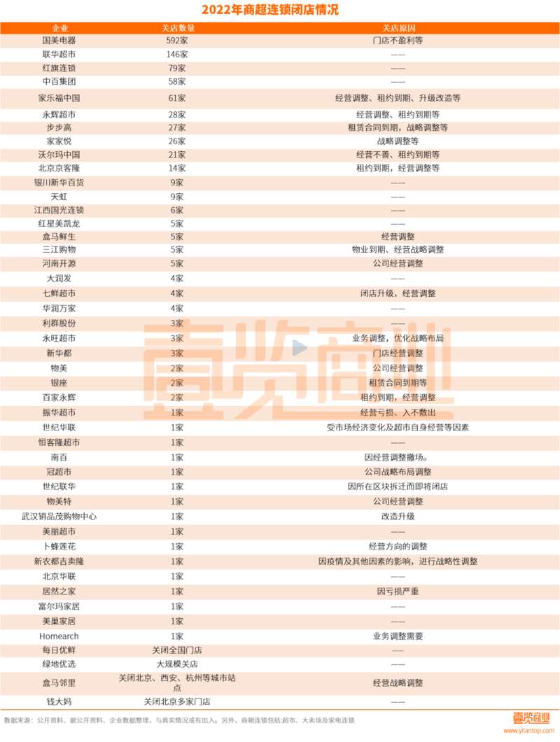 商超连锁:租约到期,承压加剧据壹览商业统计,2022年,商超行业中有至少1138家门店宣布关闭,覆盖46家企业。其中,国美零售关店近600家、联华超市关店146家、红旗连锁关店79家、家乐福关店54家、沃尔玛关店21家等等。