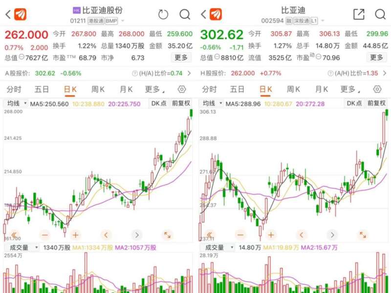 目前来看,比亚迪股价并未受到巴菲特减持影响。相较于2022年四季度的震荡走势,2023年以来,比亚迪股价大幅回升。截至2月2日收盘,比亚迪H股报收262港元/股,年内上涨37%,A股报收302.62元/股,年内上涨19%。