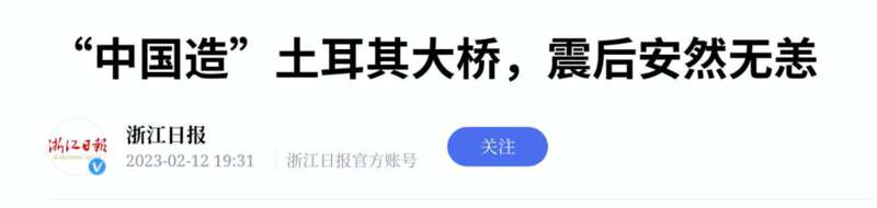 2月10日,蜀道集团官号发文《经受住地震考验!“蜀道建造”土耳其大桥无恙》,文中提到蜀道集团所属四川路桥是该大桥唯一参建中资企业,承担其中全部的钢箱梁安装工作,得益于高抗震等级的设计和过硬的施工技术,大桥经受住了持续地震的考验。并且文中还出现了“中国造”“四川桥”等字眼。