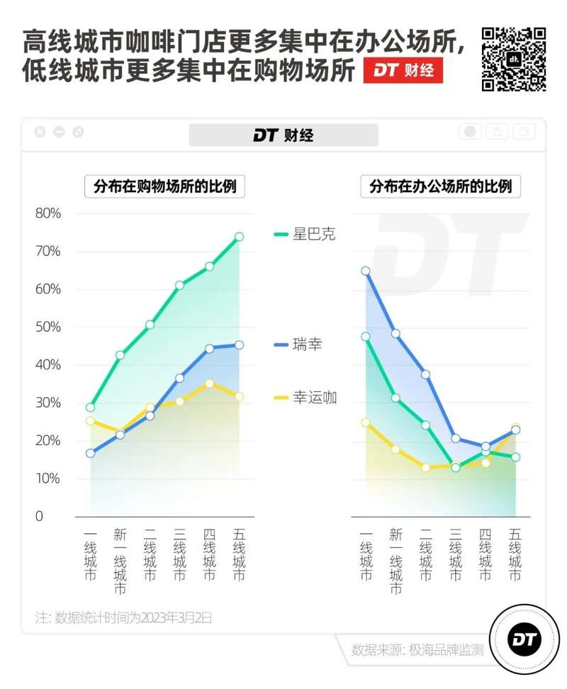 高线城市咖啡门店更多集中在办工场所,低线城市更多集中在购物场所图片来源:DT财经数据来源:极海品牌监测
