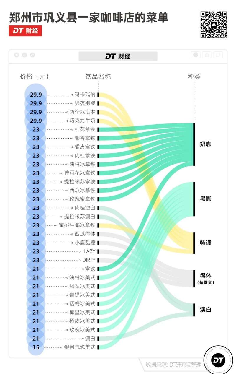 另一位咖啡店店主雷子,他的店位于郑州市巩义县,定价也类似。“基本款比如美式会定价便宜一些,但是特调会贵一些,大概30元一杯。”