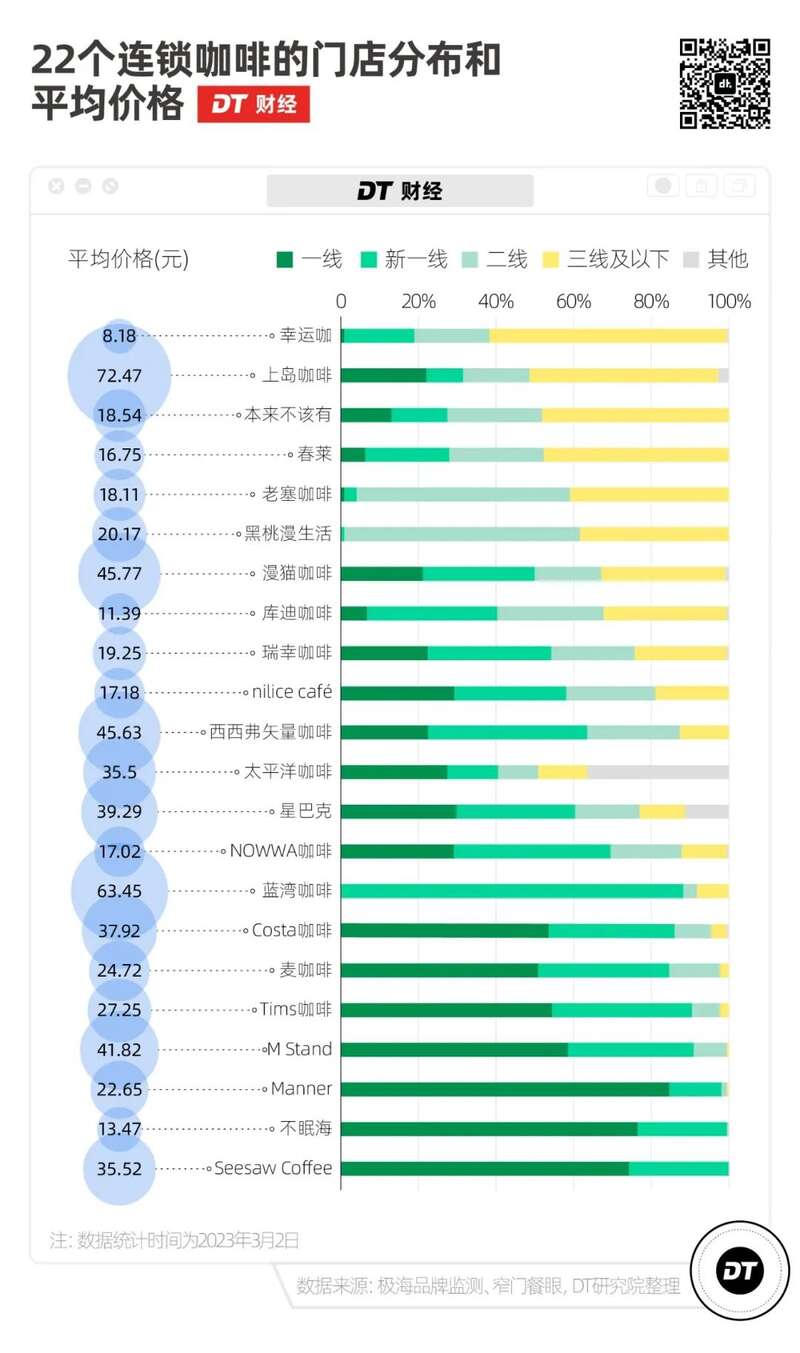 22个连锁咖啡的门店分布和平均价格图片来源:DT财经数据来源:极海品牌监测、窄门餐眼,DT研究院整理