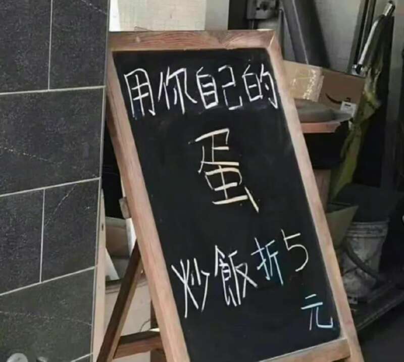 主打蛋炒饭的商家,在餐厅门口认真提示:用你自己的蛋,炒饭折5元。