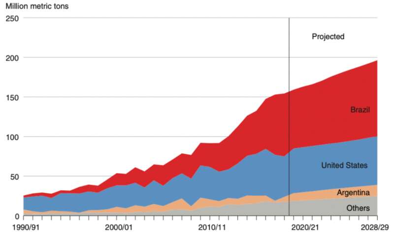 美国和巴西占了世界大豆出口增长的大部分。在20世纪90年代,美国是最主要的大豆出口国。在20世纪90年代后期,美国和巴西的出口都有所增加,以供应中国日益增长的需求,但巴西的出口增长最快。从2000年到2016年,美国的大豆出口从2700到5900公吨,增长了一倍多,但巴西的出口增长了四倍–从1500公吨米到6300公吨(图10)。假设中国的大豆关税继续存在,美国农业部预计,如果中国对美关税框架不变,2028年巴西的大豆出口将上升到9610公吨。