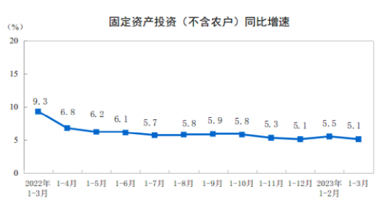 一季度,全国固定资产投资(不含农户)107282亿元,同比增长5.1%,与上年全年持平。分领域看,基础设施投资增长8.8%,制造业投资增长7.0%,房地产开发投资下降5.8%。