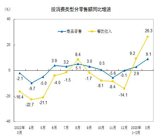 然而,把消费增长具体拆开看,餐饮收入占了大头,26.3%的涨幅跟商品零售(9.1%)相比都不在一个量级。