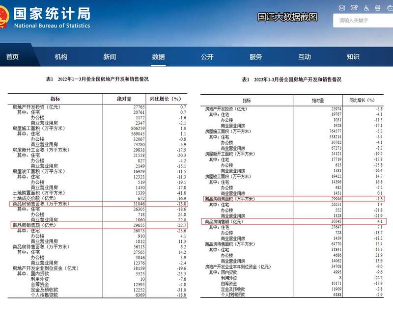 衡量内需中改善型需求的商品房销售面积一季度下降3.5%。一季度,商品房销售面积29946万平方米,国家统计局说同比下降1.8%,但与去年一季度销售面积31046万平米对比,实际下降3.5%。商品房销售额30545亿元,国家统计局说增长4.1%,但与去年的销售额29655亿元对比,实际增长只有3%。其中3月份商品房销售面积14813万平米,同比下降3.5%。商品房销售额15096亿元,增长6.3%。