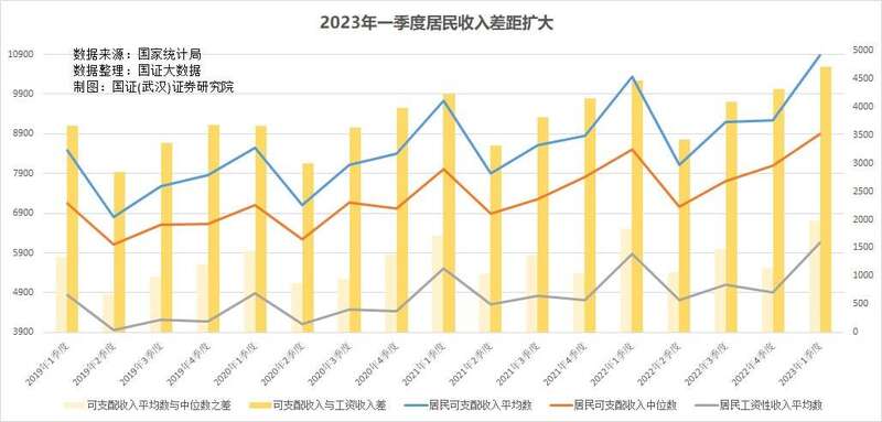 一季度,居民人均工资性收入6163元,增长5.0%,比可支配收入低0.1个百分点。与疫情之前的2019年1季度对比,2023年1季度现价GDP增长了31.2%,但居民可支配收入平均数只增长28%,比GDP低3.2个百分点,居民工资性收入仅增长27.4%,比GDP低3.8个百分点。