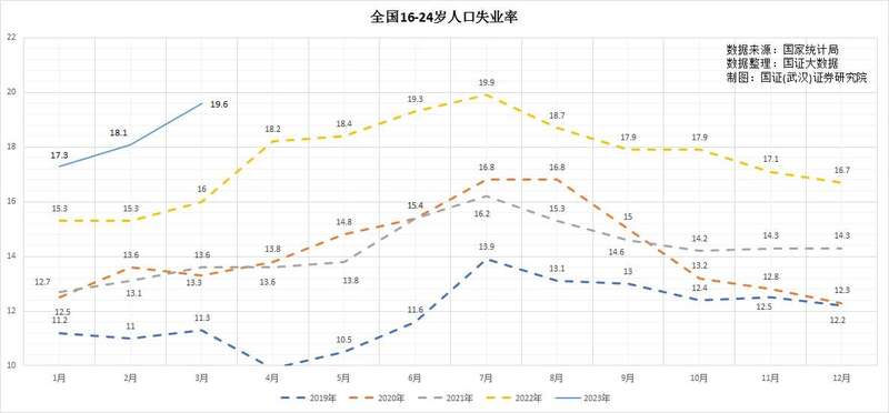 3月份,16-14岁的青年失业率达到19.6%,比2月份快速增加了1.5个百分点,比去年末增加了2.9个百分点,比去年同期增加了6个百分点,比疫情最严重的2022年3月增加了6.3个百分点,比疫情前的2019年3月增加了8.3个百分点。