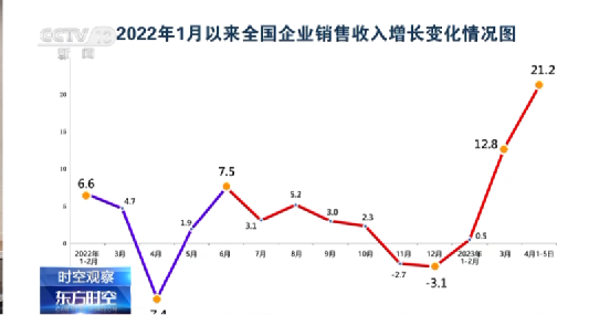 3月份全国企业销售收入同比大增12.8%,到了4月前五天更是继续一路高歌,大涨21%。
