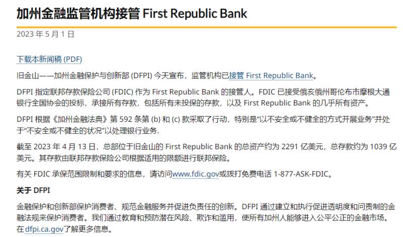 加州金融保护与创新部(California Department of Financial Protection and Innovation)表示已接管第一共和银行,并指定联邦存款保险公司(Federal Deposit Insurance Corporation)接管该银行。FDIC接受了摩根大通对该银行资产的收购要约。
