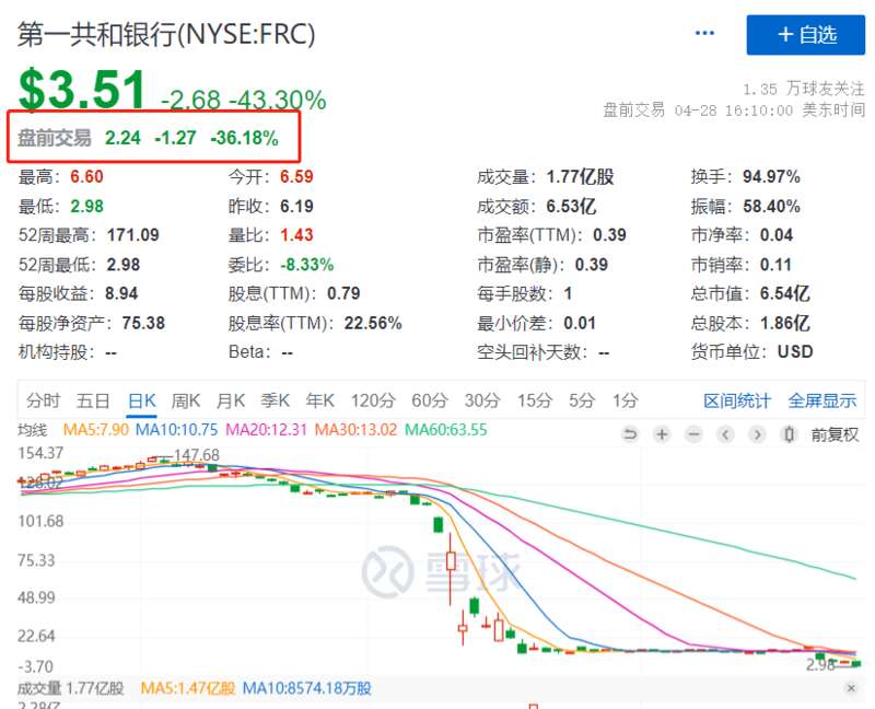 第一共和银行股价已经从高点跌去97%,消息出来后,美股盘前,股价又崩了30%。