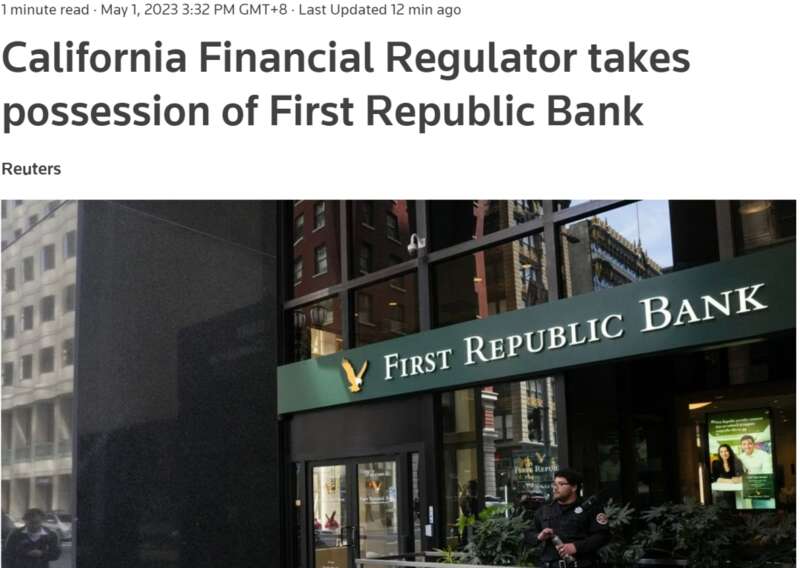 美国刚刚传来的消息,加州金融监管机构接管了第一共和银行(First Republic),这是自今年3月以来美国第三家银行破产。