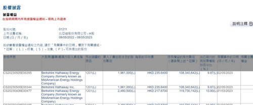 5月8日,港交所披露易显示,巴菲特旗下伯克希尔·哈撒韦在5月2日减持196.1万股比亚迪H股,减持均价235.64港元/股,总价值约4.62亿港元。这是港交所第11次披露巴菲特减持比亚迪H股。