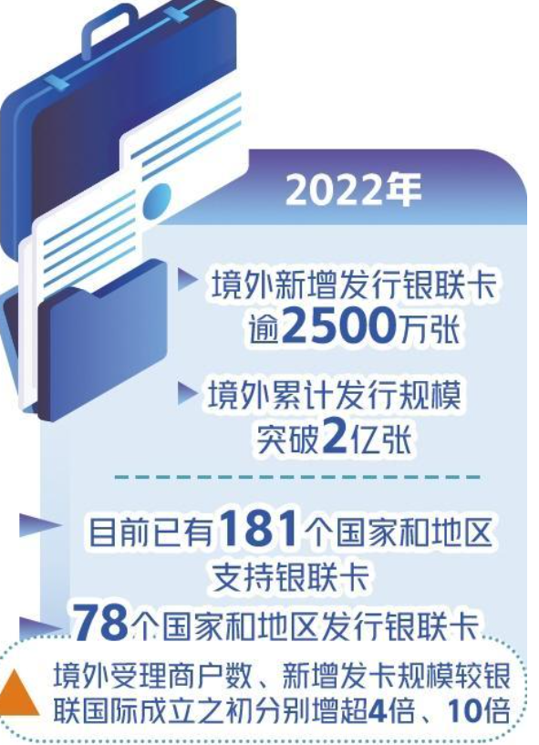 2022年12月30日,银联国际公布的数据显示,2022年境外新增发行银联卡超过2500万张,境外累计发行银联卡规模突破2亿张。全球已有181个国家和地区支持银联卡,78个国家和地区发行银联卡。这为更好地支持我国企业和居民走出去,增进中外经贸双向交流,推动我国金融基础设施走向全球,提高我国金融支付产业国际影响力发挥了积极作用。