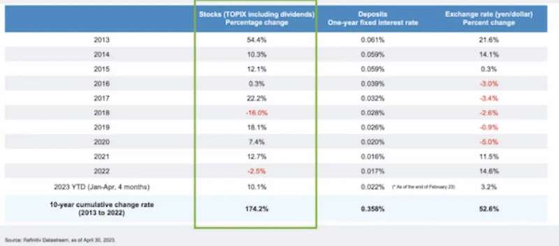 每每谈起日本,“失去的30年”“低欲望社会”“通缩”等词,似乎成了人们话语里的条件反射,然而很多人可能不知道,过去十年日本股市(东证券TOPIX指数,截至2022年底)的累计涨幅高达174%,即使记入日元的巨大贬值幅度,折合美元的回报率也有近60%,相比之下日本存款利率接近于0。