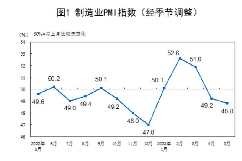 同日,国家统计局公布,我国5月份制造业采购经理指数(PMI)为48.8%,比上月下降0.4个百分点,低于临界点,制造业景气水平小幅回落。