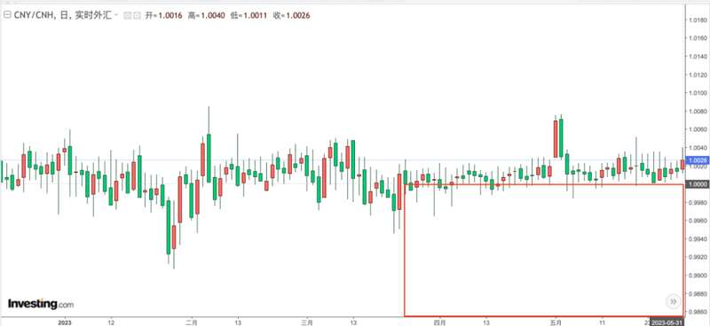 我们看一下,离岸人民币和在岸人民币汇率的比值,波动中枢已经达到了1.0020,显著高于1.0000。