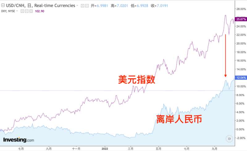 我们对比一下,2022年5月到10月份人民币汇率那波贬值,离岸人民币汇率从6.7一直贬值到7.3,创历史记录。