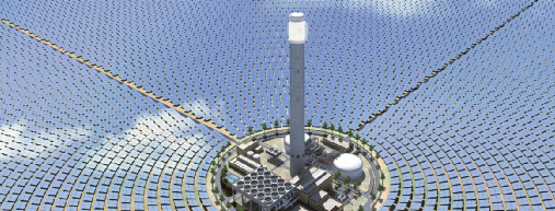 上万块镜子(不是光伏板)立在地面上,像向日葵一样追着太阳的方向,把阳光反射到一座上百米的高塔顶端,把高塔集热器当中的水加热变成高温蒸汽,再通过管道输送,推动汽轮发电机发电。