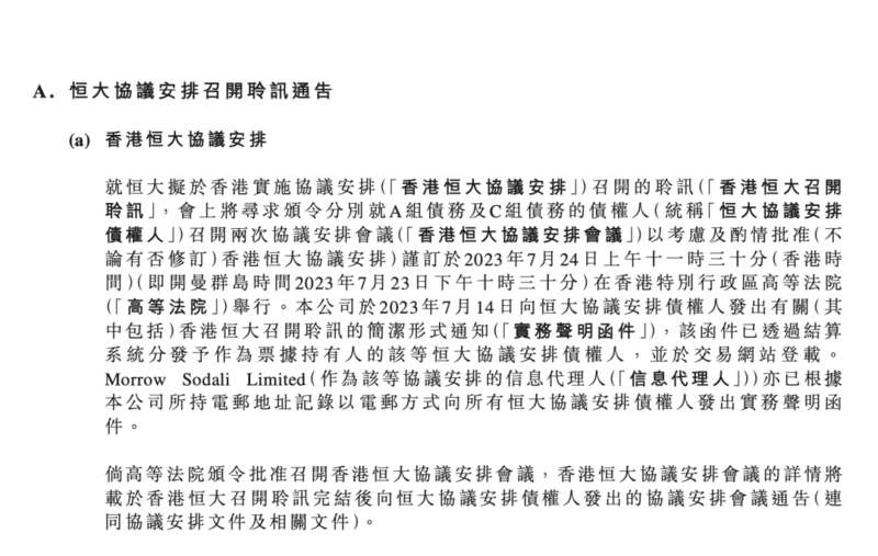 Morrow Sodali Limited(作为该等协议安排的信息代理人)亦已根据公司所持电邮地址记录以电邮方式向所有恒大协议安排债权人发出实务声明函件。