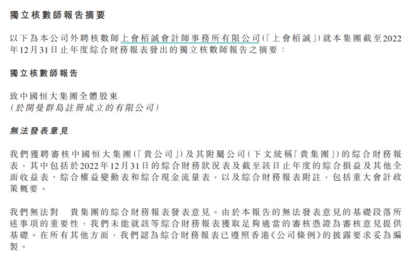 对这两份年报,中国恒大的外聘核数师上会栢诚会计师事务所表示,对该年报无法发表意见。“中国恒大未来现金流量的不确定性对集团继续持续经营的能力产生重大疑虑。我们认为,综合财务报表已就此情况作出适当披露,但我们无法就贵集团偿付到期财务责任的能力获取足够审核凭证,而我们认为有关持续经营基础的此等重大不确定性对综合财务报表的潜在累计影响重大,以致我们无法发表意见。”