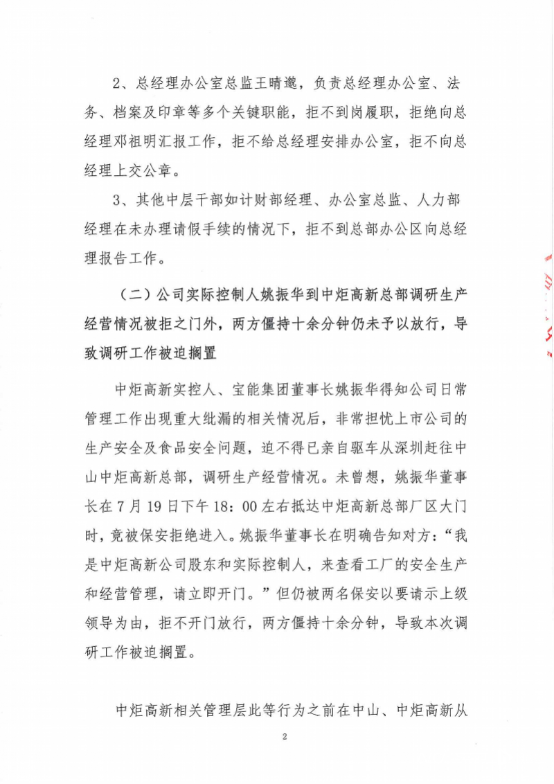 针对宝能系提及不让姚振华进入厂区,以及对新任经营高管断电等行为,中炬高新称,考虑到此时距离公司正常下班时间已超过1.5小时,且当时厂区办公大楼因供电系统故障,正处于抢修当中,所有工作人员均已下班离开厂区。