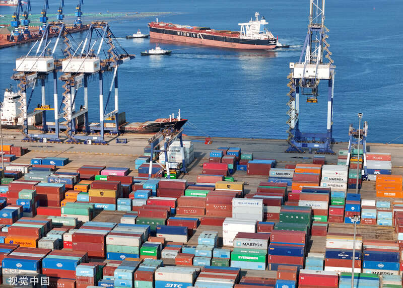 2023年8月6日,山东烟台港,繁忙的集装箱码头。(图源:视觉中国)