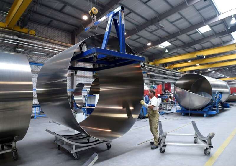 2018年7月,一名工人在德国温森一家筒仓和液体罐车制造商工作(图源:路透社)