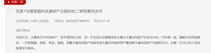 一、二审法院均认为,范某的行为属于严重损害夫妻共同财产利益的重大过错,侵害了曹某的平等支配权,故支持了曹某的诉讼请求,判令范某给付曹某88.9万元。
