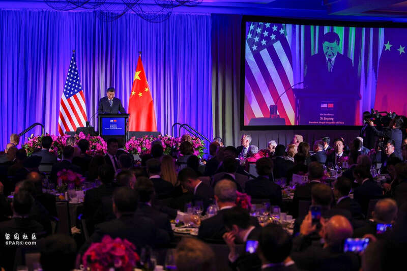 习近平访问美国期间在晚宴上向一群企业高管发表讲话。 POOL PHOTO BY CARLOS BARRIA