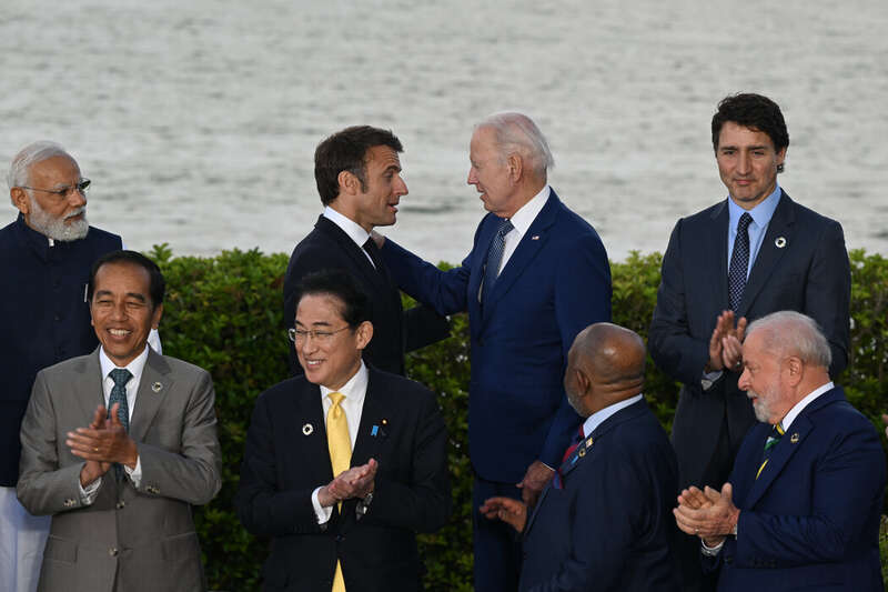 5月在日本举行的G7峰会上,拜登与法国总统马克龙进行了交谈。 KENNY HOLSTON/THE NEW YORK TIMES