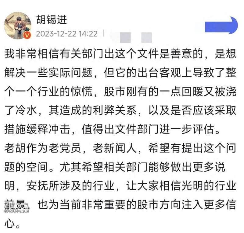 在游戏板块暴跌超7%之后,“韭菜网红”胡锡进发表了一番意味深长的言论。这位口口声声支持有关部门“善意管理”的老同志,言语间却表达出了对“行政强力冲击行业发展”的担忧,显然胡锡进并不看好即将出台的《网络游戏管理办法》。让人感到意外的是,同样被大A割韭菜的网友似乎并不都站在老胡这边,有的网友甚至觉得胡锡进此番表态就是“韭菜的无能狂怒”。那么,胡锡进到底是为了国家大局,还是为了一己之私呢?