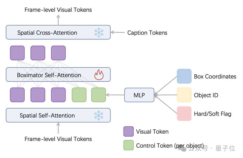 技术层面,从架构上看,Boximator在视频扩散模型的每个空间注意力块中增加了一个新的自注意力层,用于处理由对象ID、硬/软标志和边界框坐标编码的控制token。