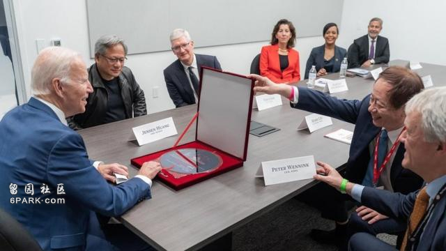 图像加注文字,台积电董事长刘德音(右二)在台积电亚利桑那工厂装机仪式后赠送给拜登的礼物是一片晶圆。拜登左方是辉达黄仁勋。