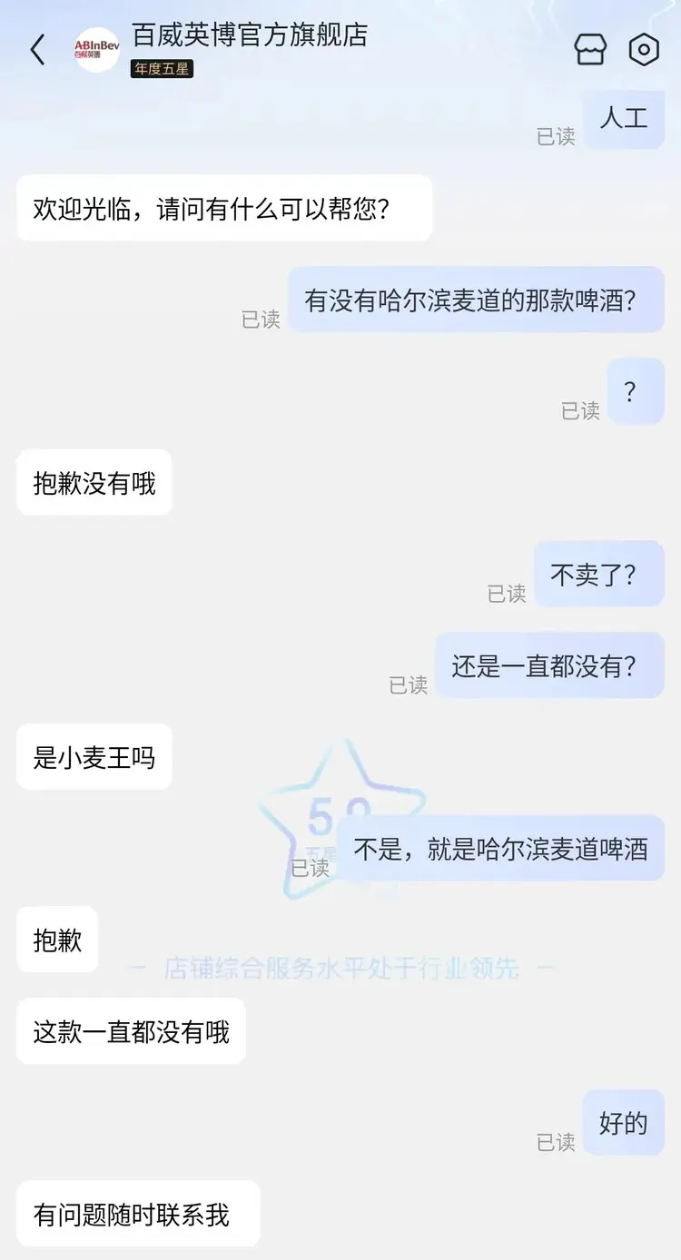 有网友在哈尔滨啤酒官方旗舰店询问时,得到客服人员“一问三不知”的回复。