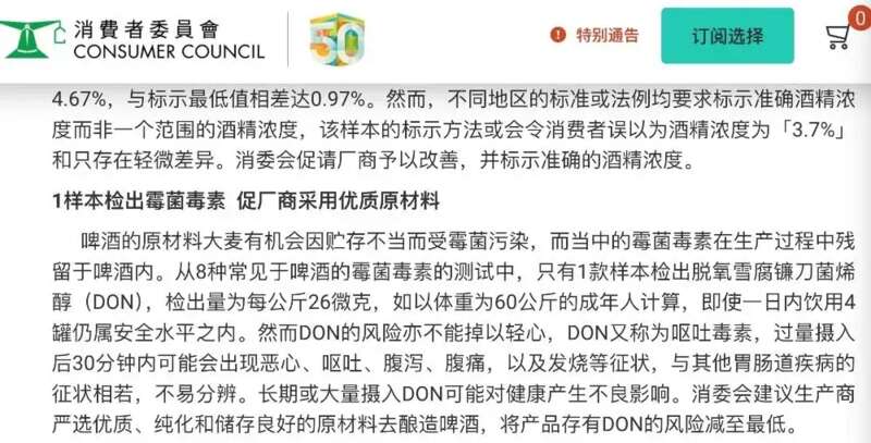 前几天,香港消费者委员会指出,哈尔滨啤酒在香港出售的某一款产品,“呕吐毒素DON”含量超标,每公斤含量26微克,服用过多会导致人体中毒,出现发烧、呕吐等症状。