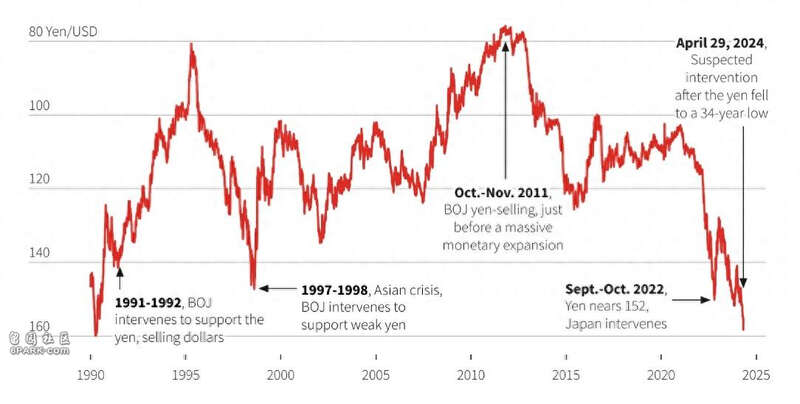 此前,4月24日晚,日本东京外汇市场日元对美元汇率跌破1美元兑155日元水平,这是自1990年6月以来日元对美元汇率首次触及该水平。此后,日元汇率仍一再走低,4月29日早盘曾一度跌破1美元兑换160日元。