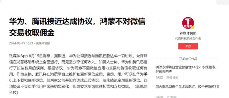据澎湃新闻、蓝鲸TMT等媒体报道,华为、腾讯即将达成协议,将微信排除在收入分成之外,允许微信在其鸿蒙操作系统上运行而不收取应用内收入分成。