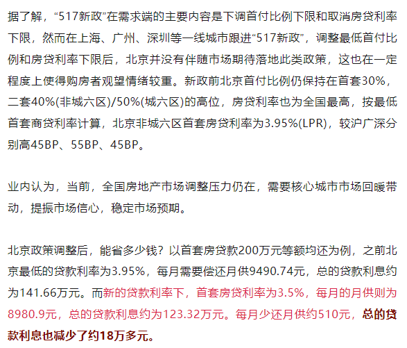 千呼万唤始出来。在上海、广州、深圳等一线城市跟进“517新政”,调整最低首付比例和房贷利率下限后,6月26日,北京宣布调整住房商贷最低首付比例和利率下限,首套房最低首付比例从30%调整至20%,5年期以上首套房贷利率下限调整为3.5%;调整住房公积金房贷最低首付比例;支持多子女家庭改善性住房需求;提高购买绿色建筑、装配式建筑或者超低能耗建筑的住房公积金贷款额度,最高至160万等政策措施。最低首付比例降至20%
